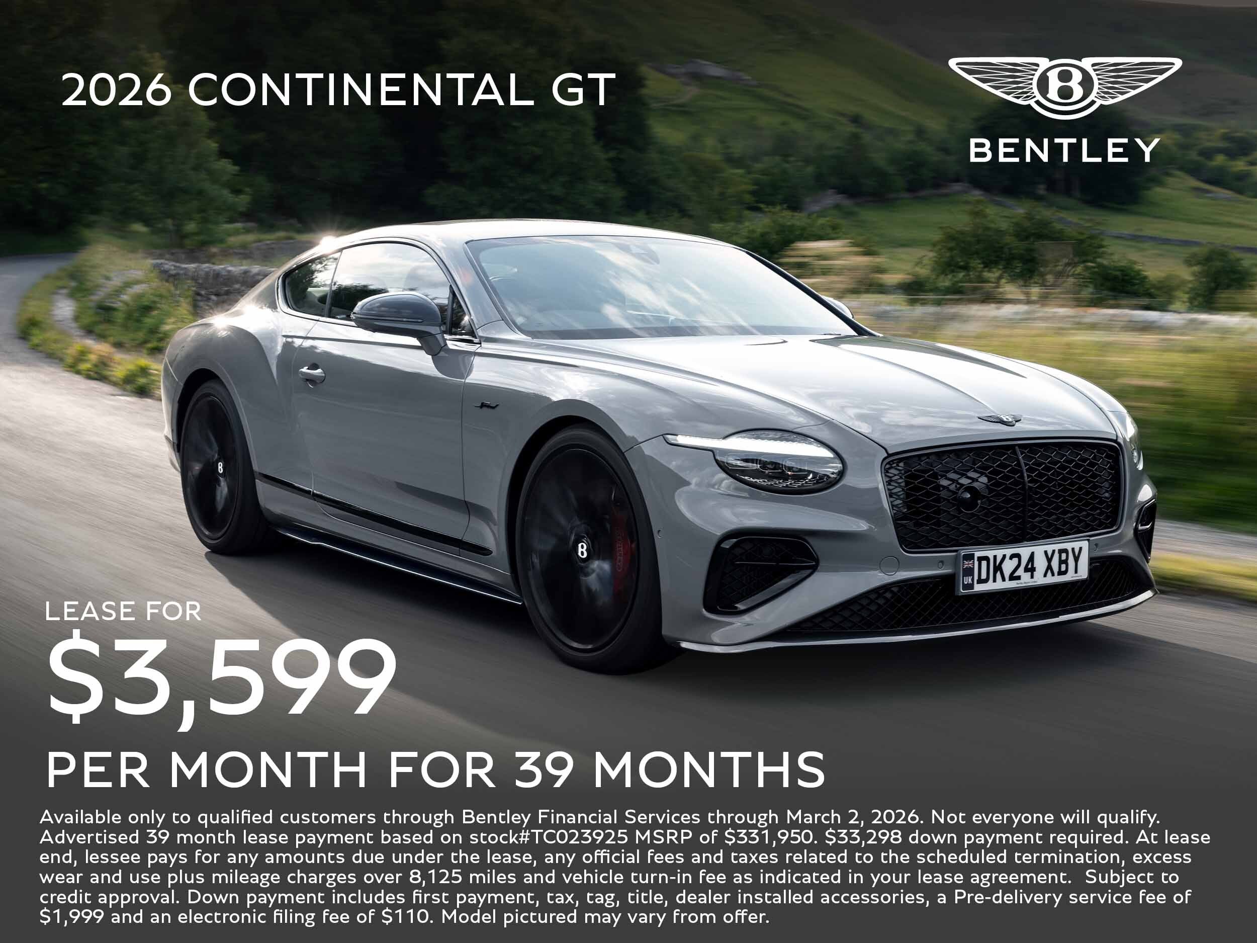 Available only to qualified customers through Bentley Financial Services through March 2, 2026. Not everyone will qualify. Advertised 39 month lease payment based on stock#TC023925 MSRP of $331,950. $33,298 down payment required. At lease end, lessee pays for any amounts due under the lease, any official fees and taxes related to the scheduled termination, excess wear and use plus mileage charges over 8,125 miles and vehicle turn-in fee as indicated in your lease agreement. Subject to credit approval. Down payment includes first payment, tax, tag, title, dealer installed accessories, a Pre-delivery service fee of $1,999 and an electronic filing fee of $110. Model pictured may vary from offer.