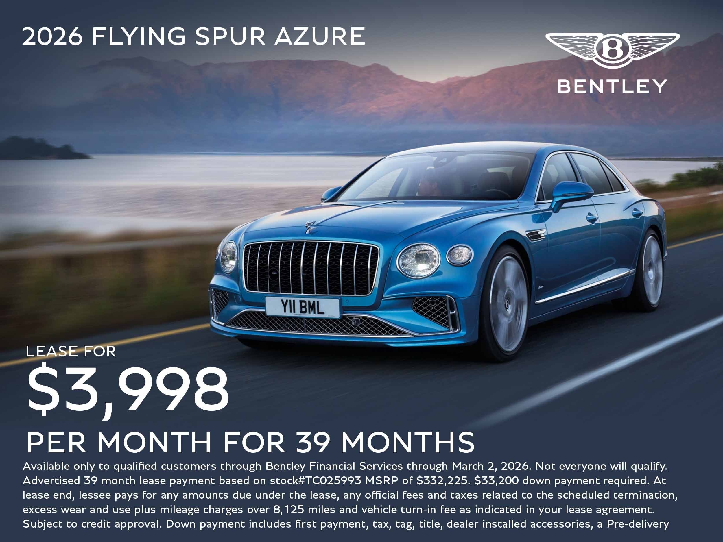 Available only to qualified customers through Bentley Financial Services through March 2, 2026. Not everyone will qualify. Advertised 39 month lease payment based on stock#TC025993 MSRP of $332,225. $33,200 down payment required. At lease end, lessee pays for any amounts due under the lease, any official fees and taxes related to the scheduled termination, excess wear and use plus mileage charges over 8,125 miles and vehicle turn-in fee as indicated in your lease agreement. Subject to credit approval. Down payment includes first payment, tax, tag, title, dealer installed accessories, a Pre-delivery service fee of $1,999 and an electronic filing fee of $110. Model pictured may vary from offer.